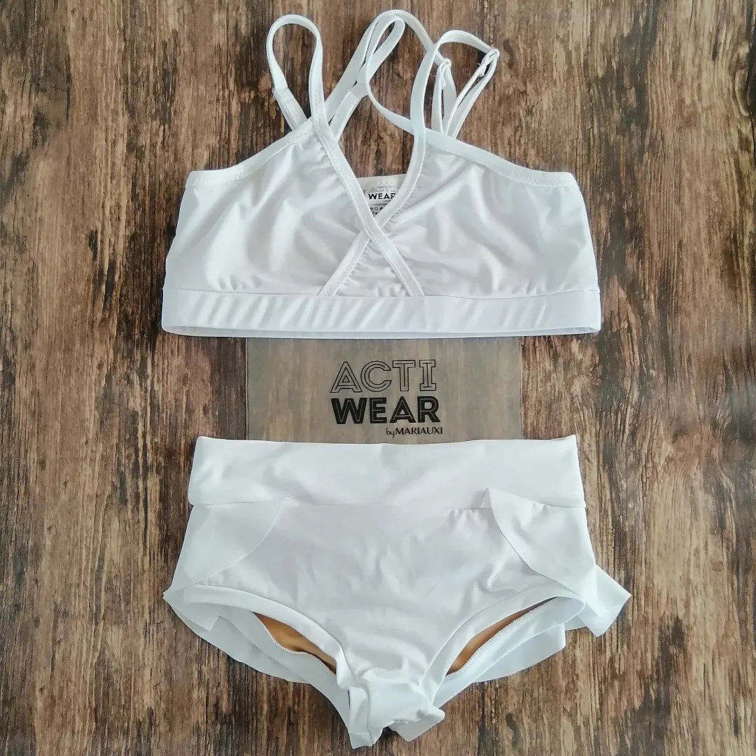 Set de top con abertura al frente, tirantes con espalda descubierta y un short básico con holán decorado con un hermoso moño en la parte superior. Confeccionado en lycra para mayor durabilidad y confort al momento de lucirlo.