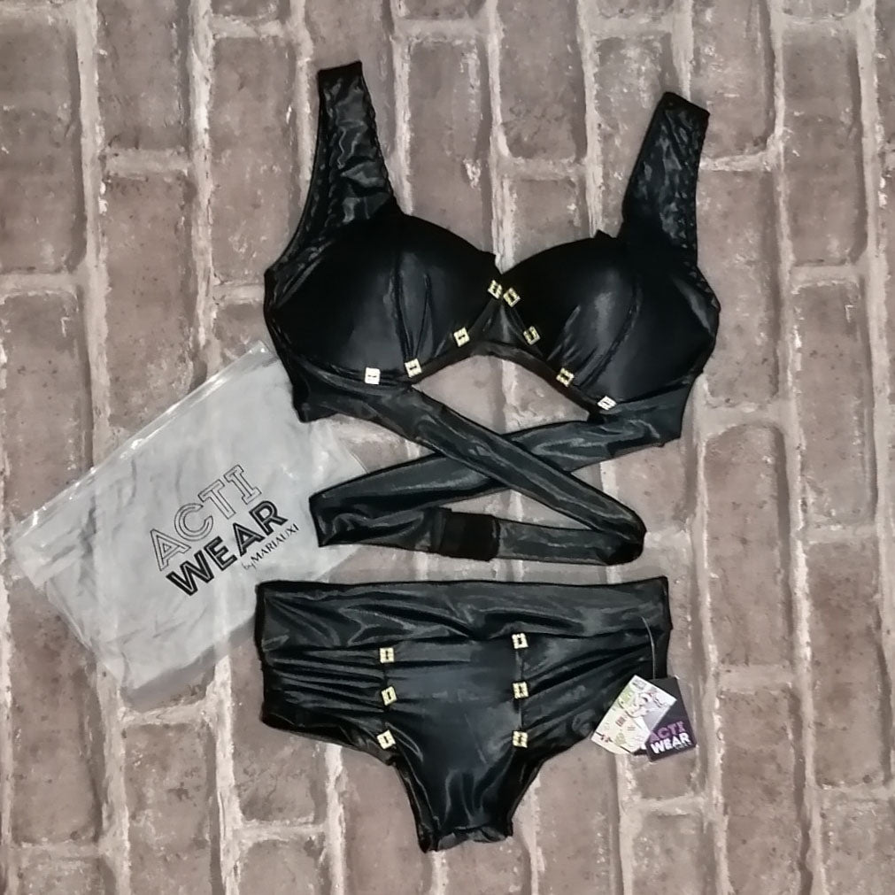 Set confeccionado en lycra tipo vinipiel con cortes sensuales y pasamanería dorada que dan una inspiración Rockera. Consta de un Top con tiras entre cruzadas en el talle y un short corte básico con fruncido en los laterales.