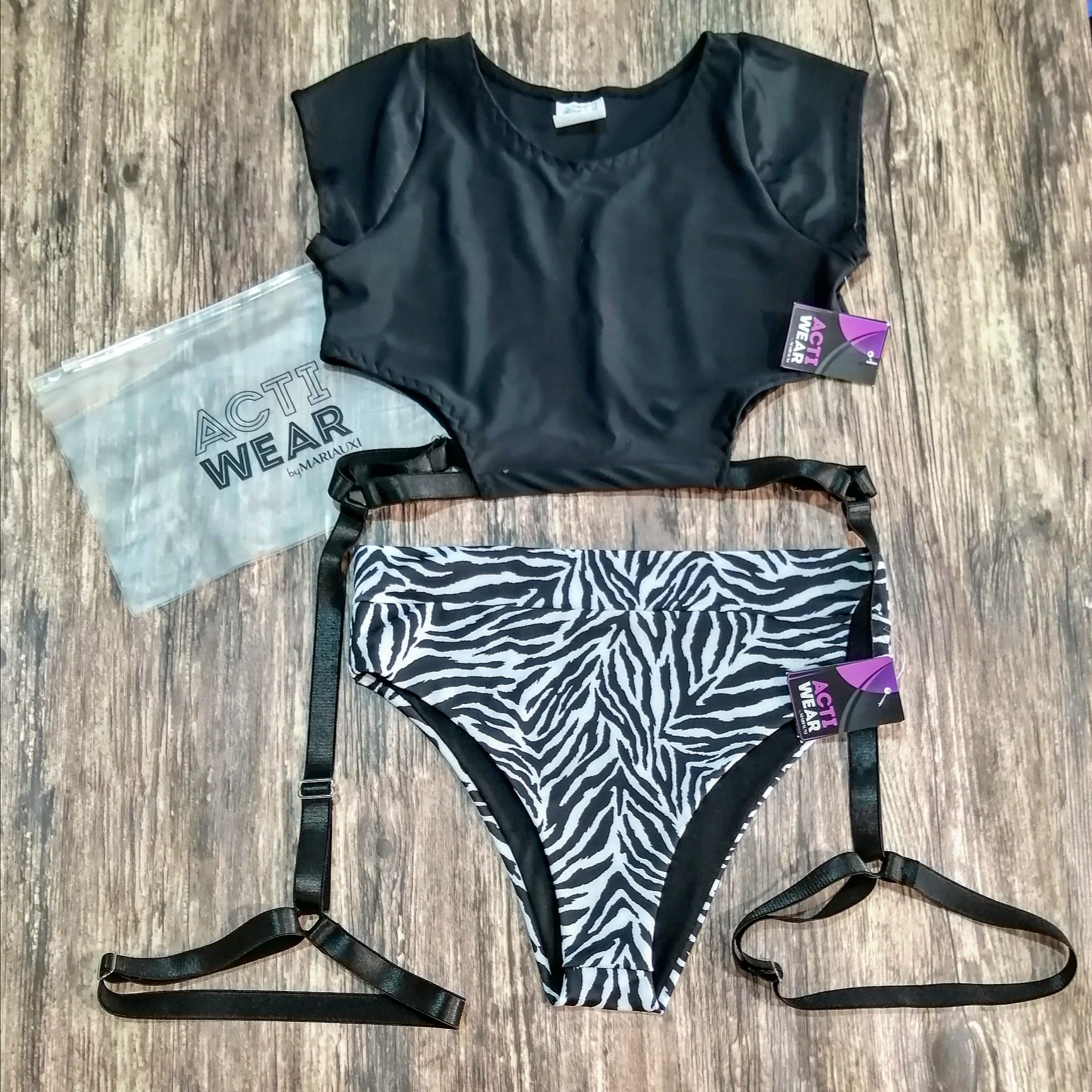 Set confeccionado en lycra la cual te aporta confort y mayor durabilidad. Consta de dos piezas, un top completo con ligeros ajustables y un short de corte alto con un estampado divino de cebra.